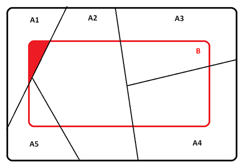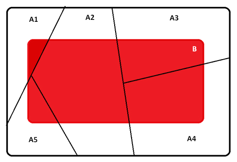 La ecuación anterior tiene varios enfoques que son de gran utilidad, vamos a iniciar con el enfoque más teórico y para ello usaremos el concepto de probabilidad total visto anteriormente, si nos fijamos podemos observar que el numerador de la ecuación es la probabilidad conjunta de Aj y B; una manera de verlo visualmente con un ejemplo seria de la siguiente manera.
