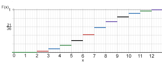 \[\large F(x)= \left\{ \begin{array}{lcc} 0 & & -\infty < x \leq 1 \\ \\ F(2) = P(X \leq 2) = \frac{1}{36} & & 1 < x \leq 2 \\ \\ F(3) = P(X \leq 3) = \frac{3}{36} & & 2 < x \leq 3 \\ \\ \vdots & & \vdots \\ \\ F(12) = P(X \leq 12) = 1 & & 11 < x \leq \infty \end{array} \right. \]