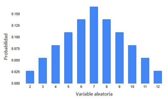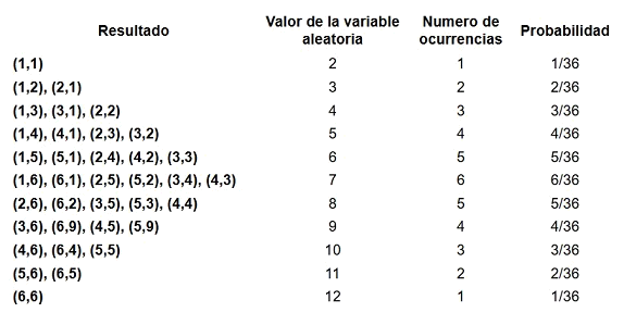 Aplicando el concepto de variable aleatoria vista en capítulos previos, a cada evento del espacio muestral podemos asignar un número que pueda describir alguna característica de este experimento, para lo cual usaremos a modo de ejemplo la suma de los dos valores obtenidos en un lanzamiento, es decir si al lanzar los dos dados obtenemos el resultado (1,4) la suma de los dos valores será 5, por lo tanto la mínima suma que puedo obtener es con el resultado (1,1) que es igual a 2 y el máximo valor posible sería el resultado (6,6) igual a 12, por lo que la variable aleatoria designada como la suma de los dos valores de los dados, está comprendida en el rango entre 2 y 12, y su representación sería la siguiente.