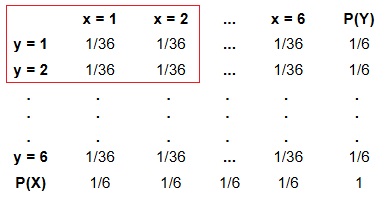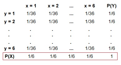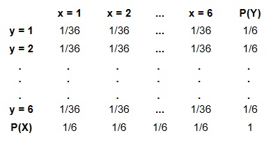 \[\large P(x_{i}, y_{j}) = P(x_{i})*P(y_{j}) = \frac{1}{6} \frac{1}{6} = \frac{1}{36} \]