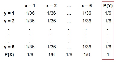 \[\large P(X=1) = \sum_{j=6}^{} P(x_{1}, y_{j}) \\ \\ \large = P(X=1,Y=1) + P(X=1,Y=2) + \dotsc + P(X=1,Y=6) = \frac{1}{6} \]