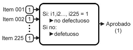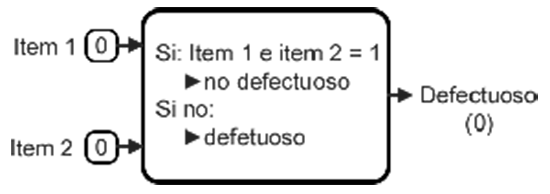 Supongamos que hacemos parte de un equipo de calidad en donde verificamos si un producto está defectuoso o no defectuoso, para eso definimos una lista de chequeo con dos criterios de validación, que llamaremos item 1 e ítem 2, se nos da la indicación de que si y sólo si todos los item se cumplen, el producto es aprobado de lo contrario está defectuoso, lo anterior se puede ver de manera visual a continuación.
