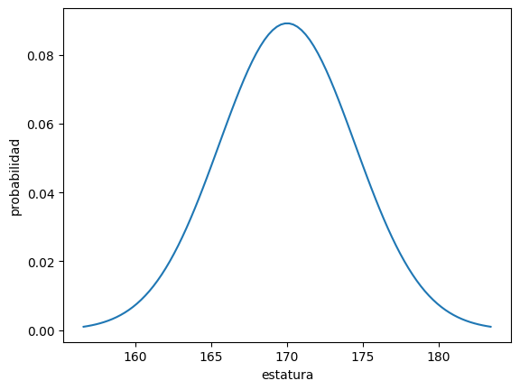 De la gráfica se puede establecer que la estatura más probable en la población de la muestra, es de 170 pues está en el pico de la campana, a medida que nos alejamos de esta estatura la probabilidad de ocurrencia de estaturas mucho más pequeñas o mucho más grandes, se reducen al punto en que son prácticamente imposibles.