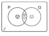 La razón del porque se resta la intersección, es porque cuando sumamos los conjuntos P y G, estamos sumando dos veces la intersección; otra forma de verlo y que expone lo anteriormente dicho sería por medio de la siguiente ilustración, en donde hemos tomado una muestra de 10 personas y establecido en función de las probabilidades que numero de personas tienen un perro y cuantas tienen un gato.
