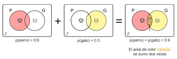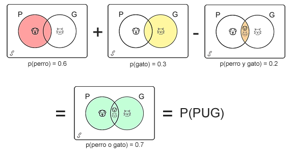 De la gráfica se aprecia que en el resultado de la suma de las probabilidades P y G, se ha sumado dos veces la probabilidad de que una persona tenga un perro y un gato (intersección P∩G), por lo tanto se hace necesario restar el valor de la intersección para poder obtener el valor de la probabilidad de que una persona tenga un perro o un gato.