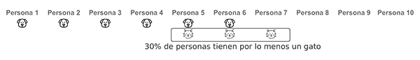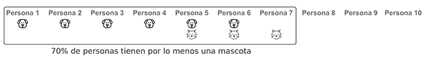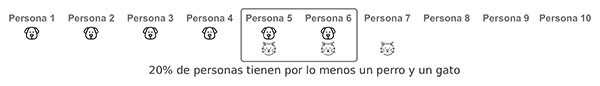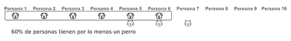De la tabla se puede apreciar que de una muestra de 10 personas, 6 de ellas tienen un perro es decir el 60%, 3 de ellas tienen un gato es decir el 30%, adicionalmente también se puede decir que 2 personas de las 10, tienen un perro y un gato es decir el 20%, y finalmente es fácil evidenciar que 7 personas de las 10 tienen un perro o un gato, lo que representa el 70%, y ese era el valor que estábamos buscando y que obtuvimos por medio de la teoría de conjuntos.