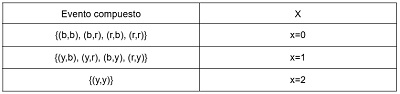 Los anteriores eventos compuestos, se pueden representar por medio de una variable aleatoria X, la cual se definirá como la cantidad de balotas amarillas que se pueden obtener en el experimento, es decir.